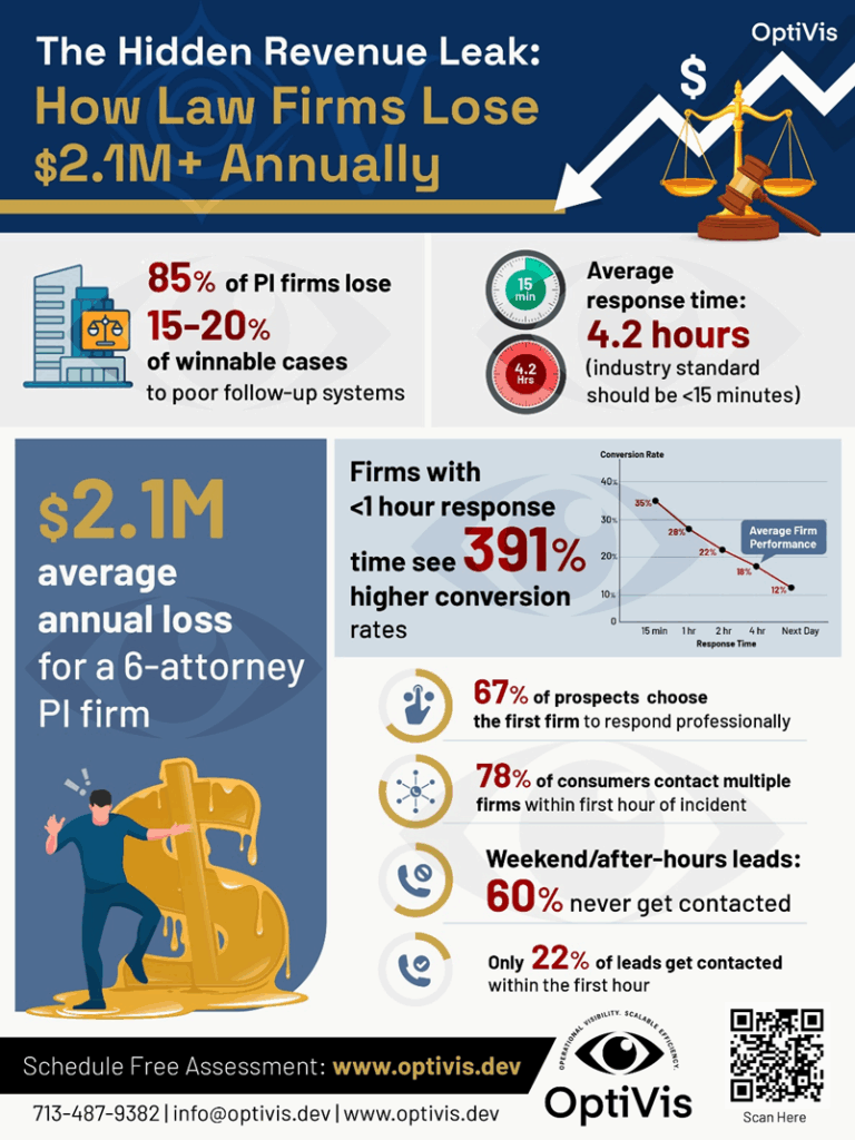 This approach positions OptiVis not as a competitor to established legal software like Clio or practice management platforms, but as the essential bridge that makes those systems deliver their promised value. When a law firm uses Clio for case management and HubSpot for marketing, OptiVis builds the automated workflows between them that eliminate manual data entry, ensure follow-up compliance, and create the operational visibility necessary for strategic decision-making.